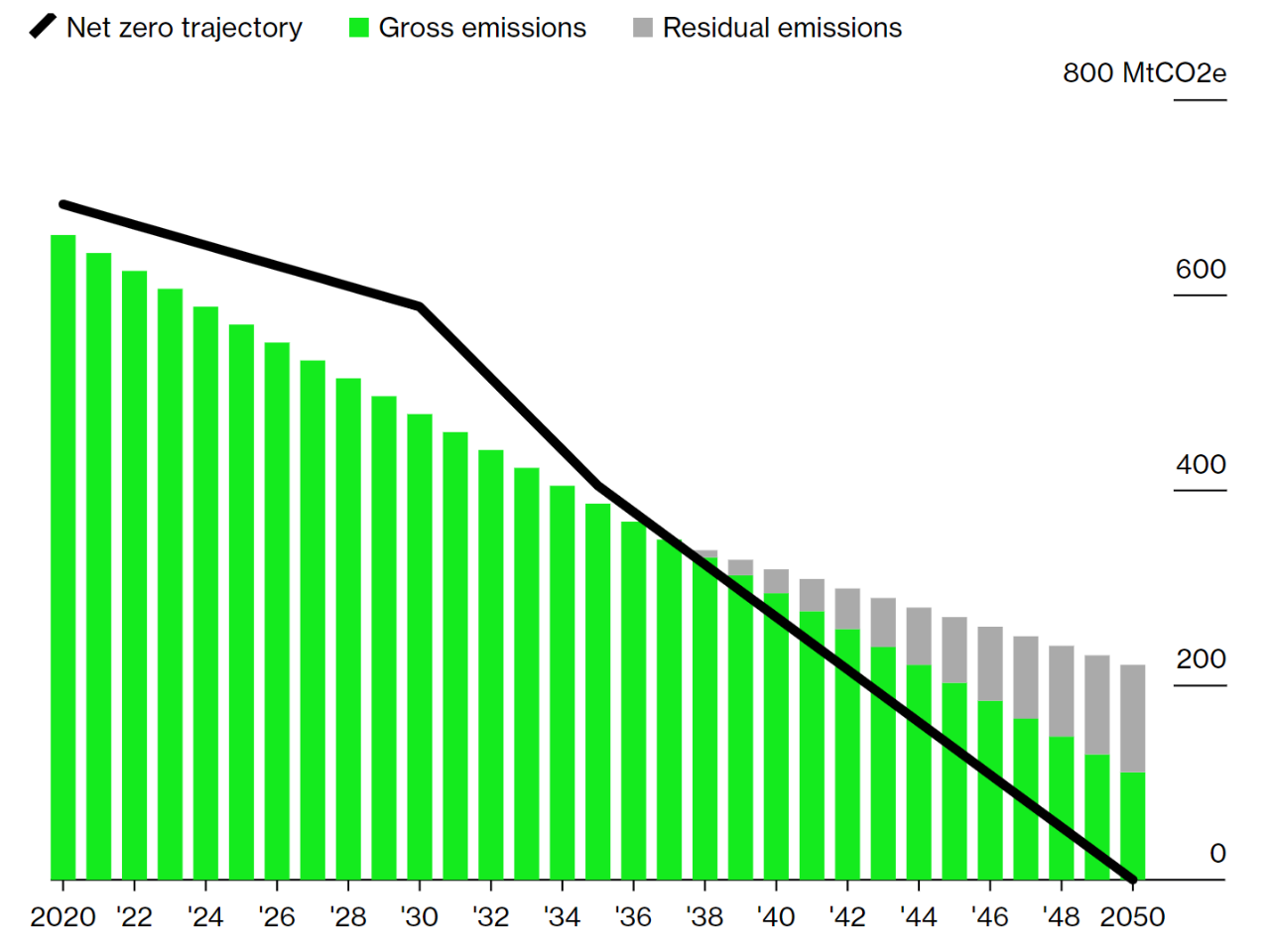 彭博新能源财经的“企业净零排放评估工具”根据壳牌披露的去碳化目标,模拟了壳牌实现零排放的路径。实际排放量可能有所不同。剩余排放量是总排放量完全减少后的剩余量,表明对碳抵消的基本需求。
