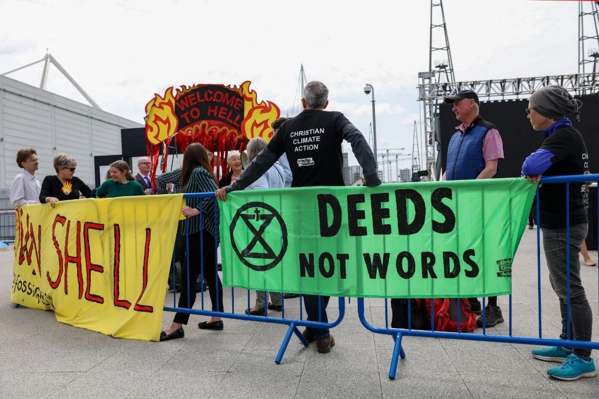 2023年5月23日,英国伦敦,公司年度股东大会外的抗议者。壳牌希望其对碳抵消项目的高标准能让最尖锐的批评者也感到满意