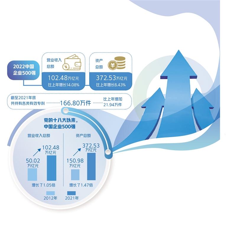 据中国企业联合会、中国企业家协会常务副会长兼理事长朱宏任介绍,“2022中国企业500强”的入围门槛为446.25亿元,较上年提高53.89亿元,创下榜单创立以来最高的提升幅度;实现营业收入突破百万亿元,为102.48万亿元,较上年增长14.08%,实现近10年来的最大涨幅;实现归属母公司股东净利润4.46万亿元,较上年增长9.63%。朱宏任表示,2021年,党中央、国务院科学统筹疫情防控和经济社会发展,我国宏观经济展现强大韧性,经济发展主要目标均顺利实现。企业经营发展也加快恢复,中国500强企业无论是营业收入,还是利润总额与净利润,总体上都实现了较快增长。值得一提的是,2022年以来,受全球疫情持续蔓延、美联储加息以及地缘冲突的影响,企业发展环境变化超出预期,短期发展压力明显加大,复苏进程面临新挑战,但长期发展向好的趋势并未发生根本改变。来自中企联的最新数据显示,党的十八大以来,中国企业500强营业收入从2012年的50.02万亿元增长到2021年的102.48万亿元,增长了1.05倍,迈上百万亿元台阶;资产总额从150.98万亿元增长到372.53万亿元,增长了1.47倍。