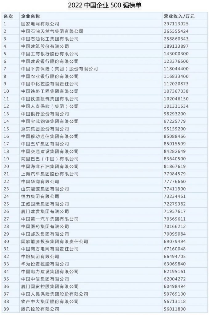 9月6日,中国企业联合会、中国企业家协会举行新闻发布会,公布了“2022中国企业500强”榜单。位列前三的企业是国家电网有限公司、中国石油天然气集团有限公司、中国石油化工集团有限公司。