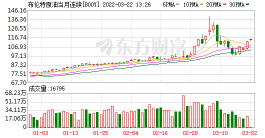 当地时间周一,国际原油期货结算价大幅收涨,WTI 4月原油期货结算价收涨7.42美元,涨幅7.08%,报112.12美元/桶。布伦特5月原油期货收涨7.69美元,涨幅7.12%,报115.62美元/桶。