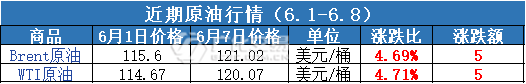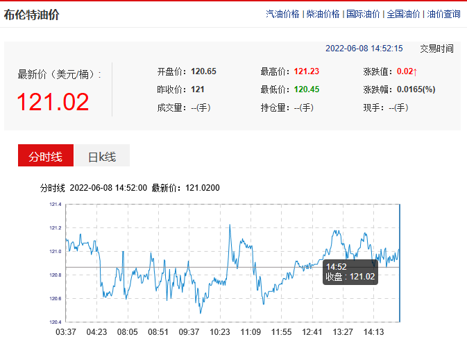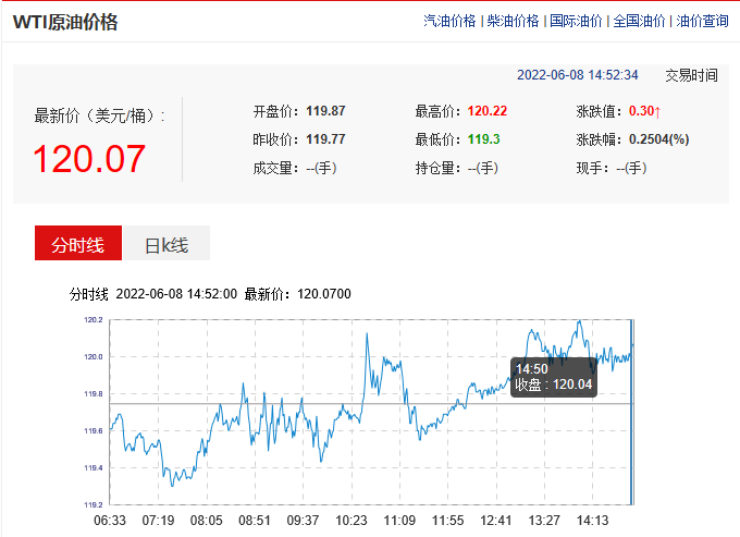 截止发稿,原油仍在上涨中,其中WTI原油收盘120.07美元/桶,涨幅为4.69%;布伦特原油收盘121.02美元/桶,涨幅为4.71%。