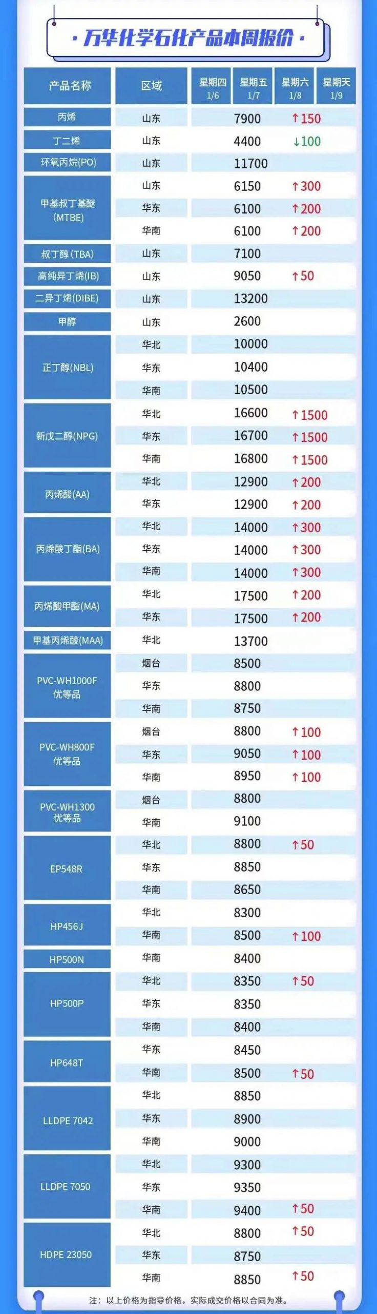 受到异丁醛涨价影响,下游新戊二醇成本压力加大,价格也应声上涨。就拿万华化学来说,1月6日华南地区报价高达16800元/吨,较去年年底的14300元/吨,上涨17.5%。