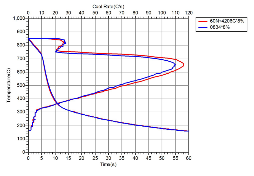 ·60N基础油分别与4206C(合成树脂)、传统Kendex 0834(石油树脂)配伍的冷却特性曲线: