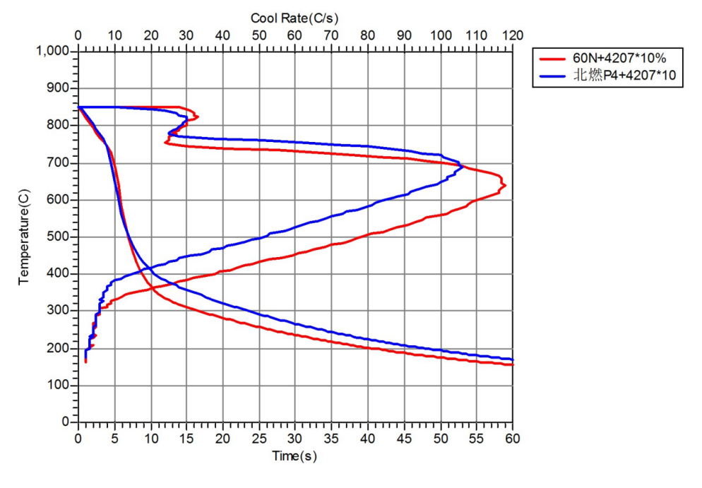 · 4207(液态单体合成树脂)分别与60N基础油、北燃P4基础油配伍的冷却特性曲线: