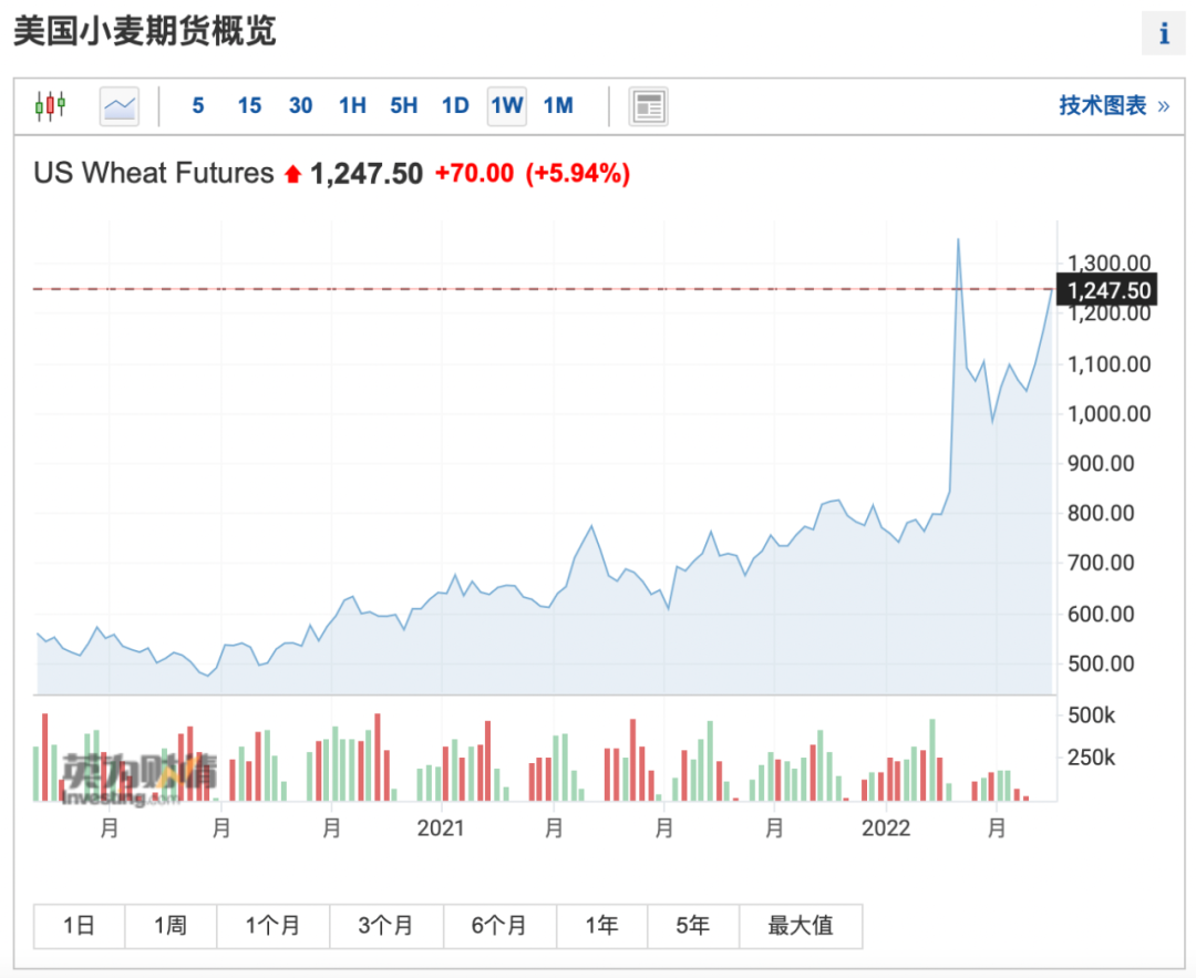 一系列突发事件冲击下,国际小麦价格一路飙涨,5月16日,美国小麦期货涨停,所有未来月份期货价格都已创出新高。截至目前,国际基准芝加哥小麦期货价格较年初已上涨超64%,伦敦小麦期货市场价格已升至历史新高。联合国世界粮食计划署警告称,人类或将面临“二战后最大的粮食危机”,多达17亿人正暴露在粮食、能源和金融系统的破坏之下,正在导致贫困和饥饿问题的恶化。