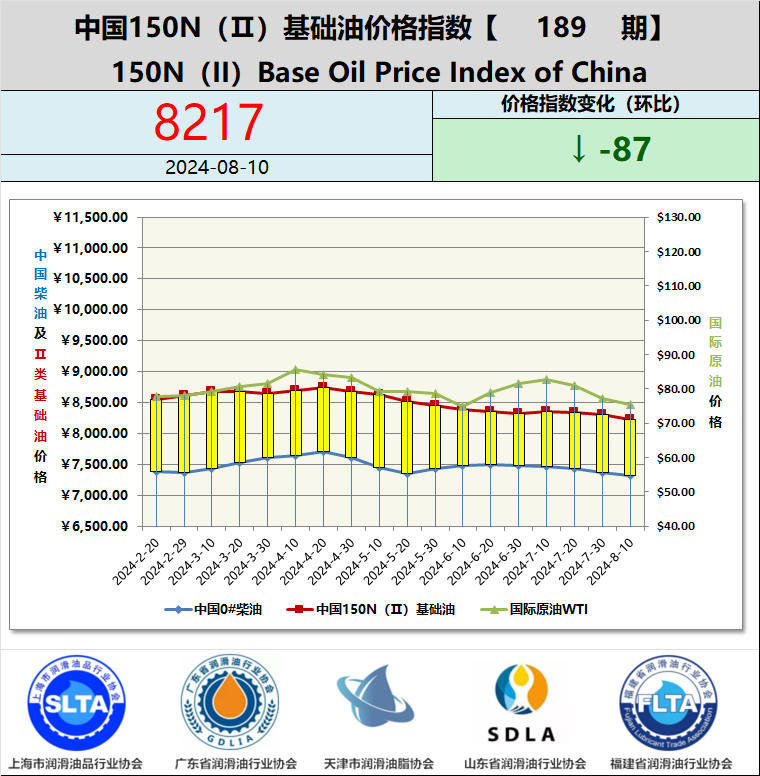 ●The figure above is a comparison of historical data to obtain China 150N (II) base oil price index curve, supplemented by the historical data curve of international petroleum WTI and China 0# diesel price as a reference basis to ensure the rationality and authority of the index.