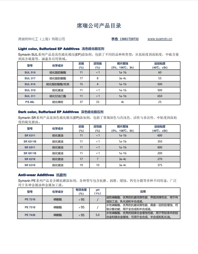 席瑞公司的核心产品包括各类硫化猪油、硫化脂肪酸酯、硫化烯烃与磷酸酯,广泛应用于各类金属加工工艺。
