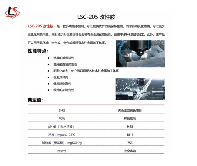 LSC-205改性胺 是一款多功能添加剂,可以提供优异的碱保持性能,同时有助乳化功能,可以减少主乳化剂的用量,…