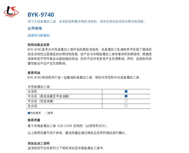 BYK-9740用于水性金属加工液,含有机硅和聚合物的消泡剂,具有优秀的自发和长期消泡性能。