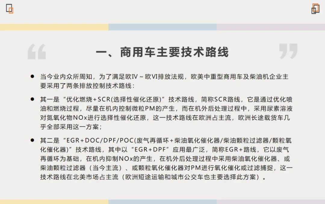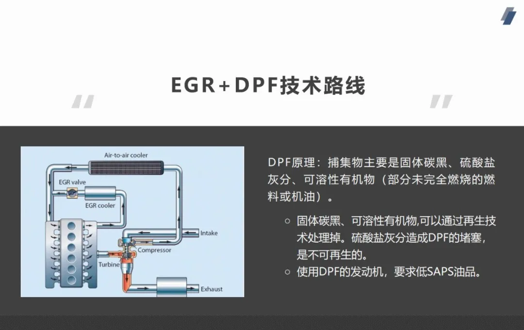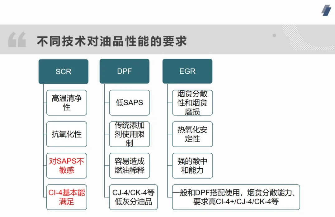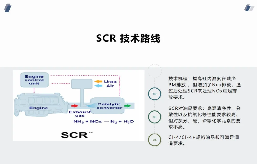 当今业内众所周知,为了满足欧Ⅳ~欧Ⅵ排放法规,欧美中重型商用车及柴油机企业主要采用了两条排放控制技术路线,即SCR路线和“GR+DOC/DPF/POC。不同的路线对润滑油提出了不同的要求。