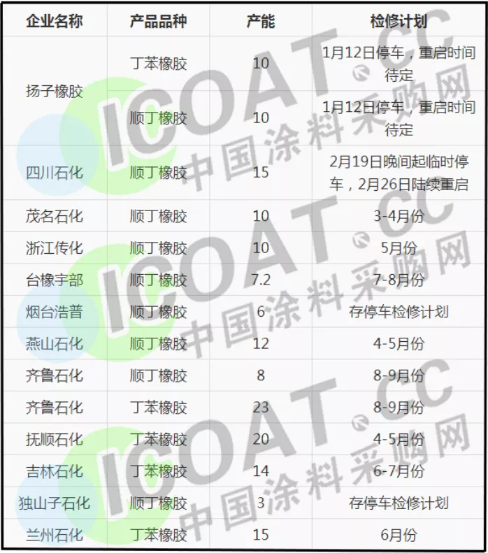 今年正逢丁苯、顺丁各装置大检修年份,3月起,陆续有装置停车检修,影响产能近200万吨/年,预计供应将收紧。