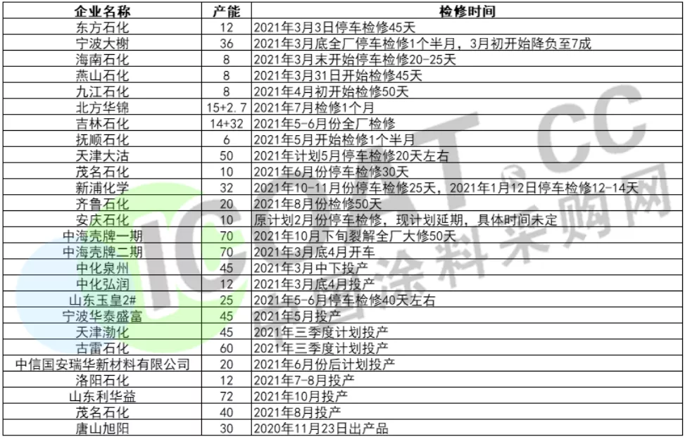 上海高桥计划于3月中下旬起对一条生产线停车检修,时长45天左右。