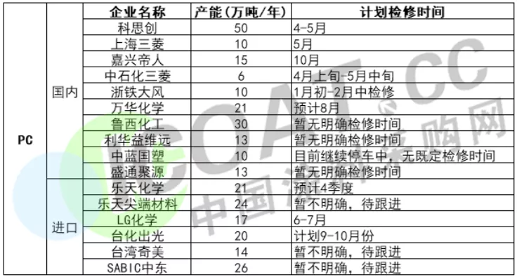 PC产业链停车计划检修超过1个月