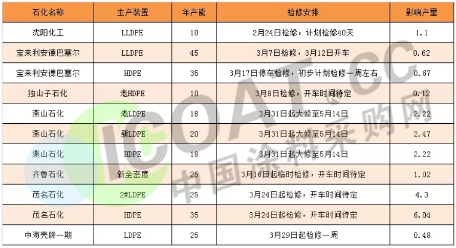 3月份国内PE主要企业检修情况汇总表(单位:万吨/年)
