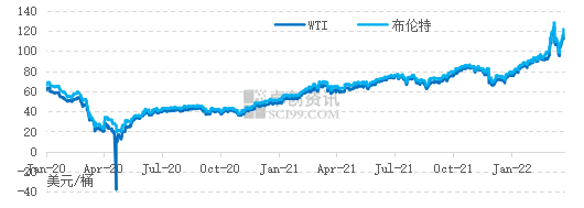 图 1 国际原油价格走势图本周油市涨势重拾,原油价格接连上行,涨幅较大,布伦特重回120美元/桶上方。供应忧虑是油市上行的主要推动力。东欧局势谈判依然存有分歧,美国将与北约、欧盟开会讨论对俄罗斯的新一轮制裁,会前欧盟对俄罗斯石油实施禁运的可能性,以及里海管线石油供应中断,令供应忧虑持续深化,推动了油价的大幅上行,另外,美国石油库存下降也为油市提供上行助力。周内油价低位反弹,创下3月8日以来的最高水平。