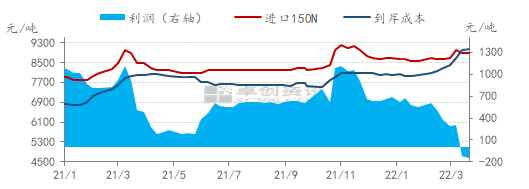 本周进口150N利润在302.67元/吨,环比上周上涨1.89%。本周外盘价格及国内售价均现走高,进口利润小幅增长。