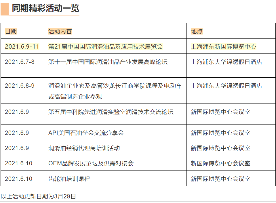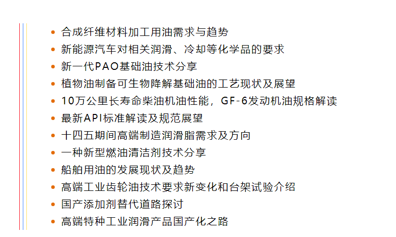 “2021中国国际润滑油品产业发展高峰论坛”将于6月7-8日在上海浦东·大华锦绣假日酒店盛大召开(第21届中国国际润滑油品及应用技术展览会将于6月9-11日,上海浦东·新国际博览中心举办)。本届论坛将在碳中和的背景下,讨论疫情复苏阶段的行业的市场动向、新能源润滑的发展趋势、润滑基础油、添加剂、及相关检测技术等最新发展动向: