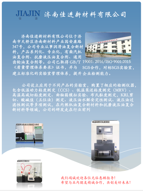 公司主要从事润滑油添加剂、燃料油添加剂的研发与产品销售。我们对于产品的研发,一直坚持高效、环保、节能的理念,致力于润滑油行业的可持续发展,始终关注并承担起相应的社会责任。我们根据客户的意愿,本着真诚协作的精神,为客户提供满意的解决方案。我们的产品,赢得了广大客户的赞许,也更加推动了新产品的研究发展。为了更好地服务于客户,我们与相关院所建立了长期的技术合作关系,推动产品的升级换代。